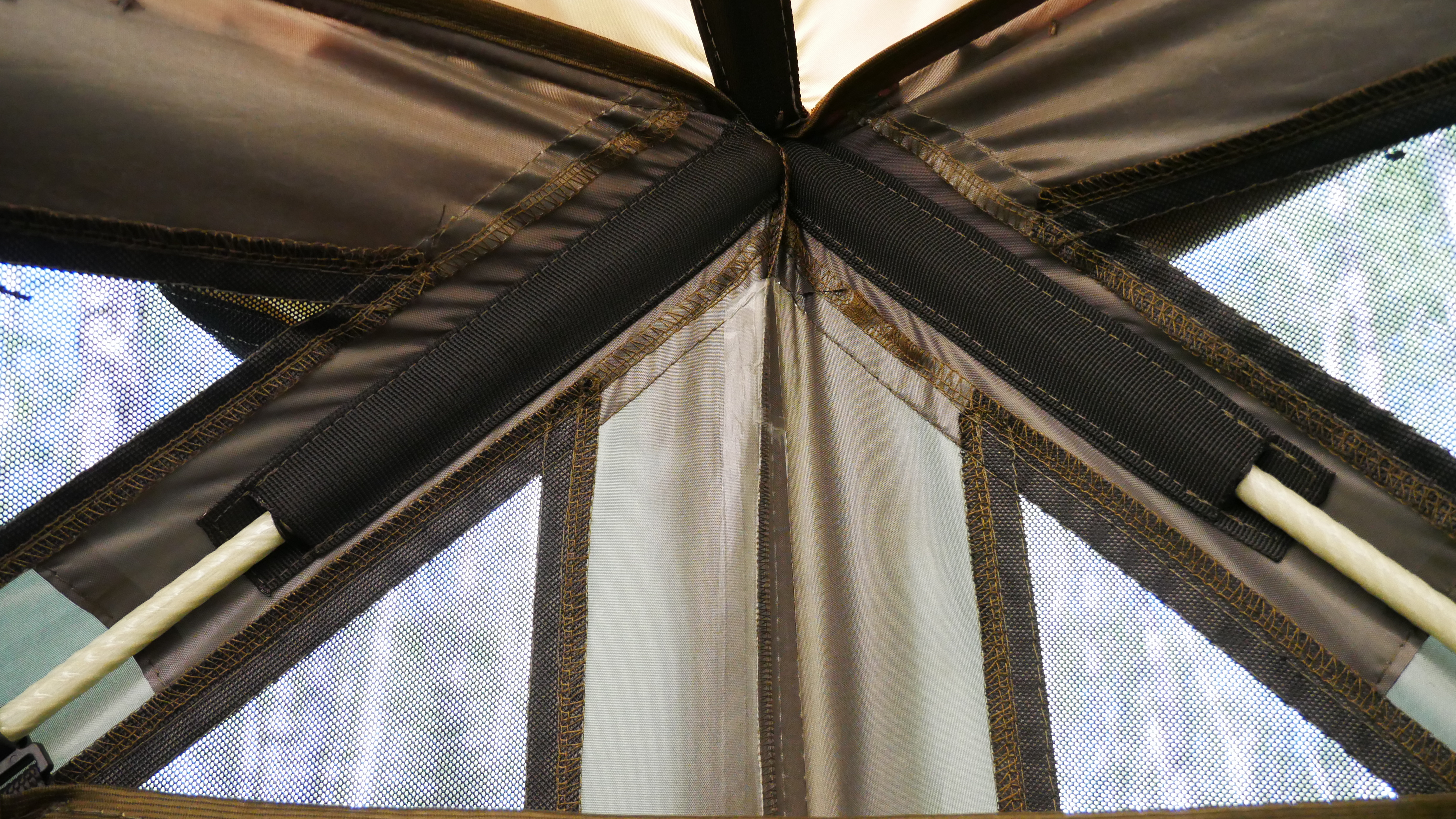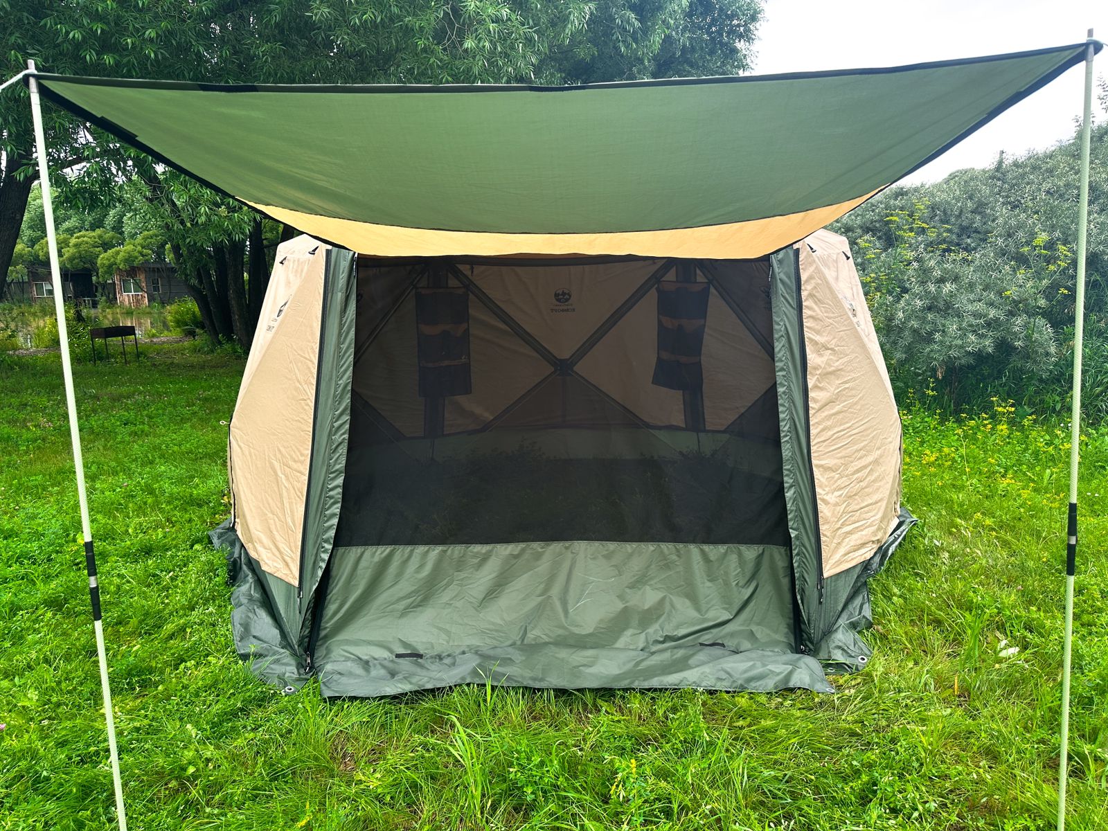 Шатёр оборудован одним большим входом с москитной сеткой в пол. Внешняя ткань тента может использоваться как солнцезащитный козырек благодаря 2 упорам из стеклокомпозитного прутка 12мм которые идут в комплекте. Входная группа может быть закрыта полностью или с поднятым внешним тентом.